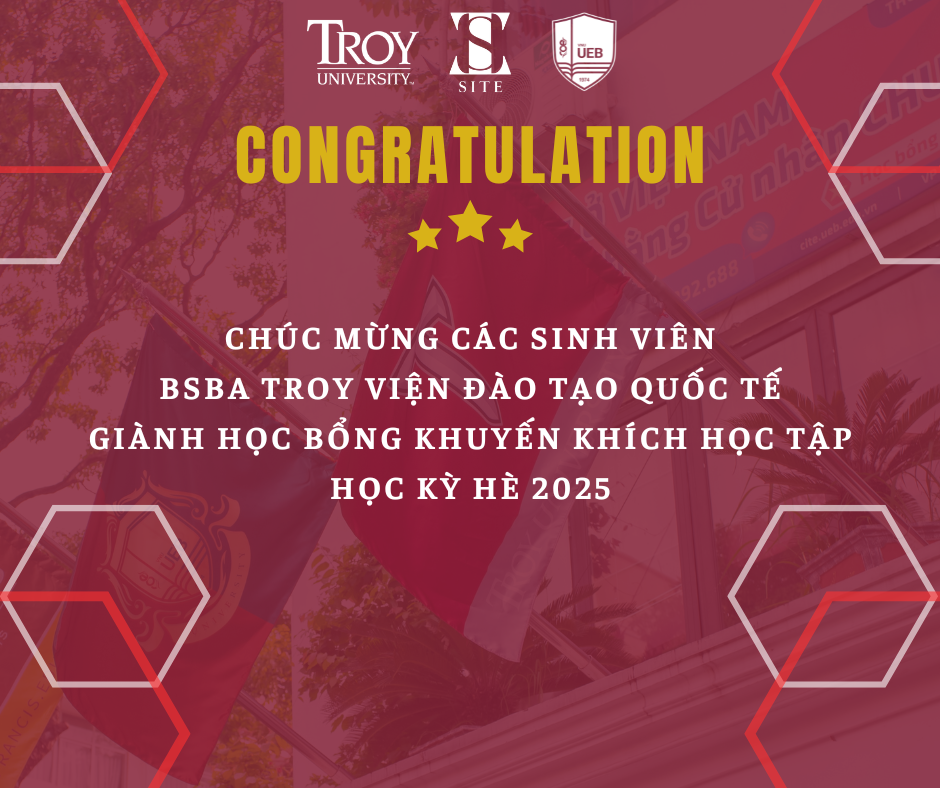 Bên cạnh học bổng đầu vào, có rất nhiều Học bổng khuyến khích học tập theo kỳ dành cho các bạn sinh viên chương trình Cử nhân chính quy quốc tế chuyên ngành Quản trị kinh doanh do Đại học Troy (Troy University, Alabama, Mỹ) và Đại học St. Francis (University of St. Francis, Illinois, Mỹ) cấp bằng. Mỗi học bổng khuyến khích học tập là sự công nhận cho cố gắng và nỗ lực học tập của các bạn sinh viên trong suốt một kỳ học.