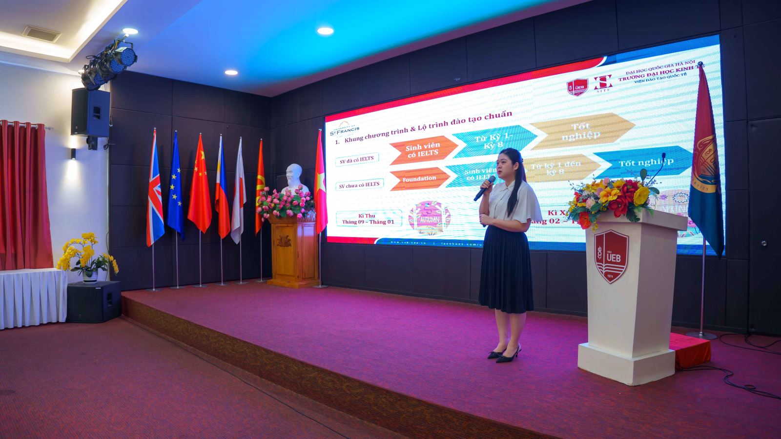 Một trong những nội dung quan trọng nhất của buổi Orientation Day là phần giới thiệu khung chương trình học và lộ trình đào tạo chi tiết. Đại diện Phòng đào tạo quốc tế đã giúp sinh viên và phụ huynh hiểu rõ cấu trúc tín chỉ, thời lượng các học kỳ, phương thức giảng dạy cũng lộ trình học tập. Đặc biệt, tính quốc tế hóa của giáo trình, đội ngũ giảng viên giàu kinh nghiệm và hệ thống đánh giá minh bạch đã được nhấn mạnh như những giá trị cốt lõi, bảo đảm chất lượng đào tạo.