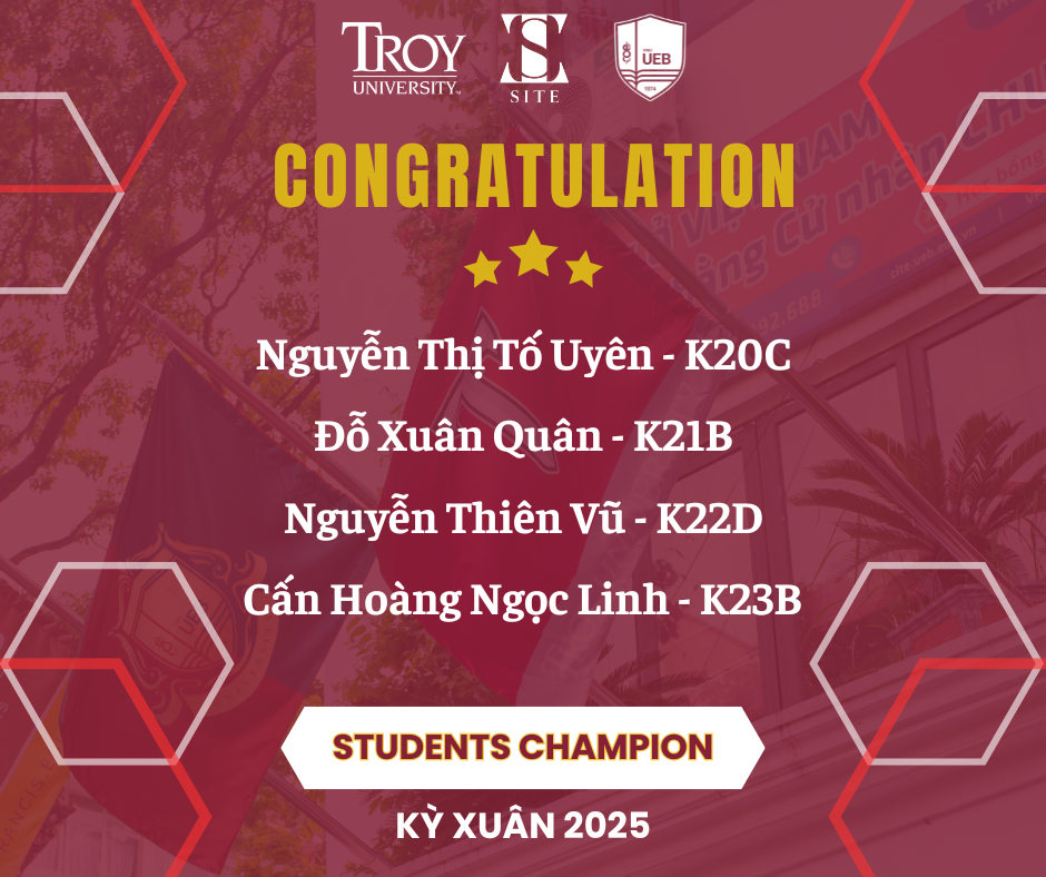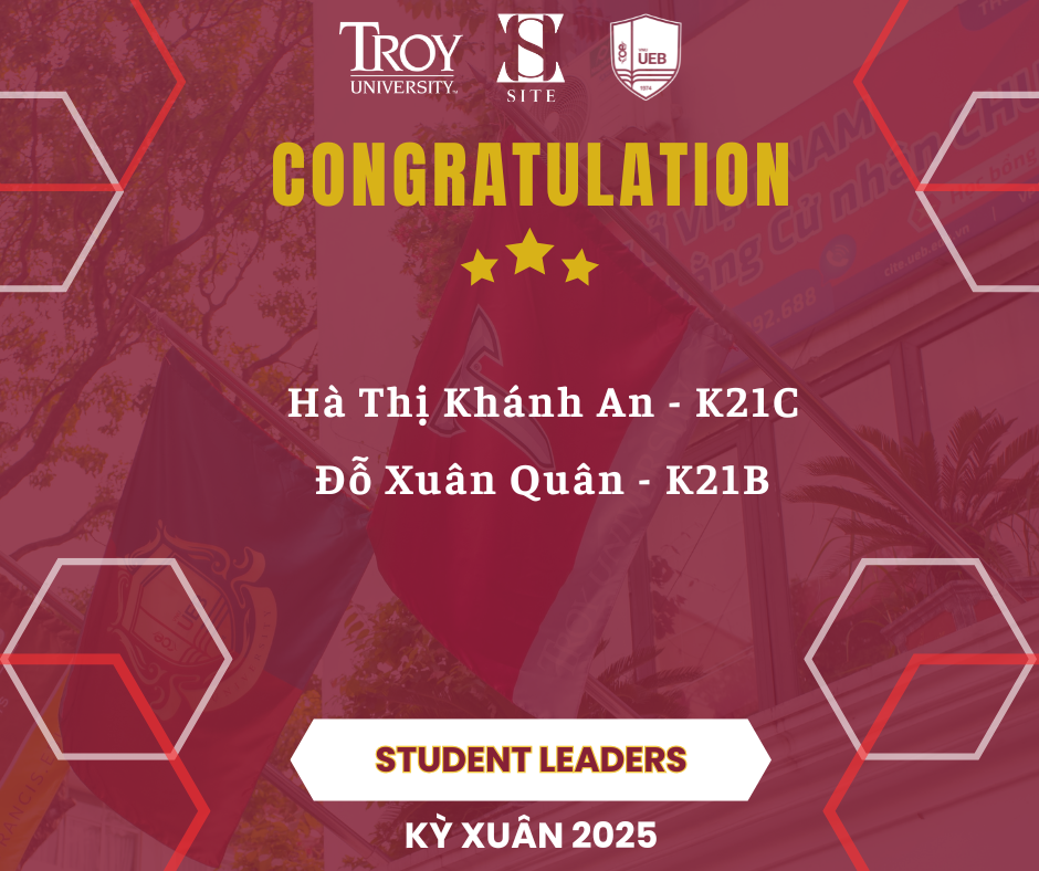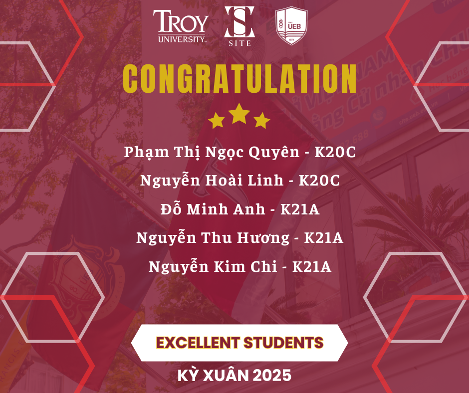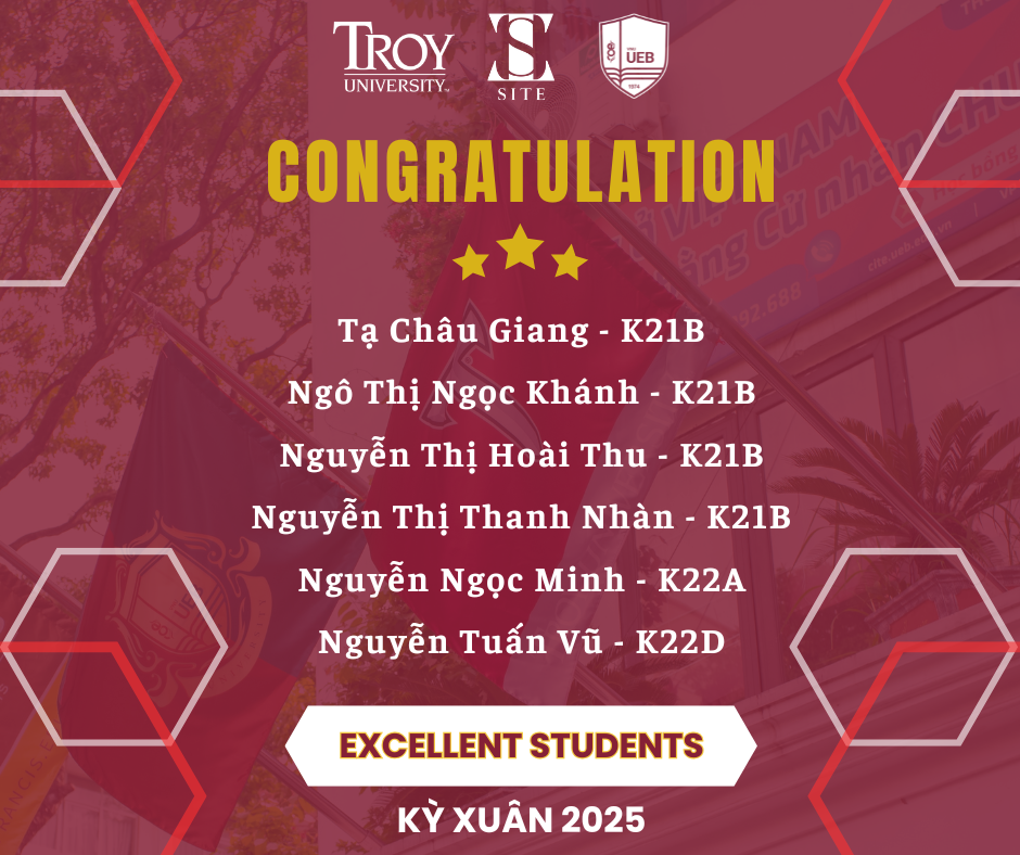 Viện Đào tạo Quốc tế, Trường Đại học Kinh tế - ĐHQGHN (UEB-SITE) tự hào vinh danh các gương mặt sinh viên xuất sắc thuộc Chương trình Cử nhân chính quy quốc tế chuyên ngành Quản trị kinh doanh do Đại học Troy (Troy University, Mỹ) cấp bằng đã giành được các học bổng khuyến khích học tập giá trị của kỳ học mùa Xuân năm 2025.