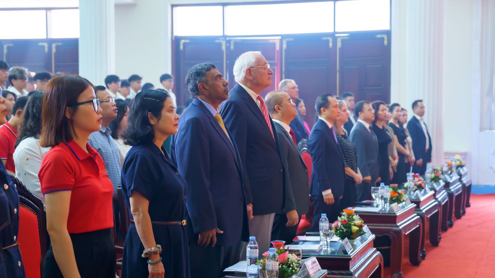 Sự kiện mở đầu bằng phần đón tiếp đại biểu, trong tiếng nhạc nền sôi động và tiếng chào hân hoan của các thầy cô, cán bộ. Sau phần ổn định tổ chức, toàn thể hội trường trang nghiêm hướng lên sân khấu để cùng cất vang Quốc ca Việt Nam và Hoa Kỳ, biểu trưng cho tinh thần hợp tác giáo dục quốc tế giữa UEB-SITE và các đối tác Hoa Kỳ – Đại học Troy và Đại học St. Francis.