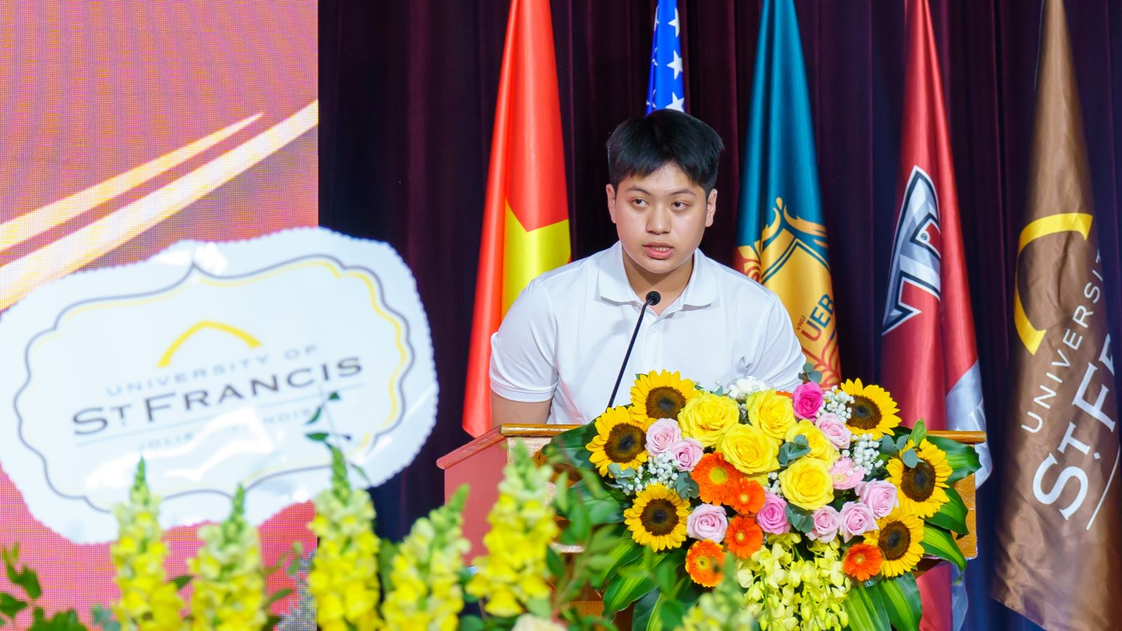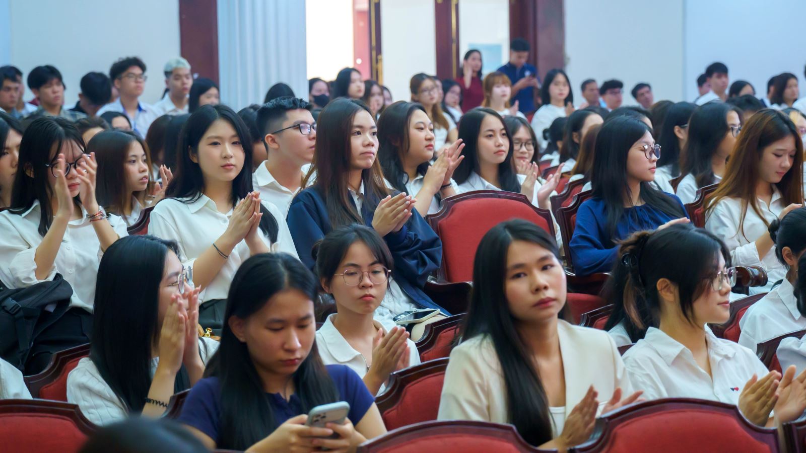 Phát biểu của đại diện tân sinh viên khóa mới là một trong những khoảnh khắc đáng nhớ nhất. Trước toàn thể hội trường, sinh viên đại diện đã chia sẻ cảm xúc tự hào khi trở thành một phần của đại gia đình UEB-SITE, đồng thời bày tỏ quyết tâm học tập, rèn luyện và đóng góp vào cộng đồng năng động, sáng tạo của Viện.