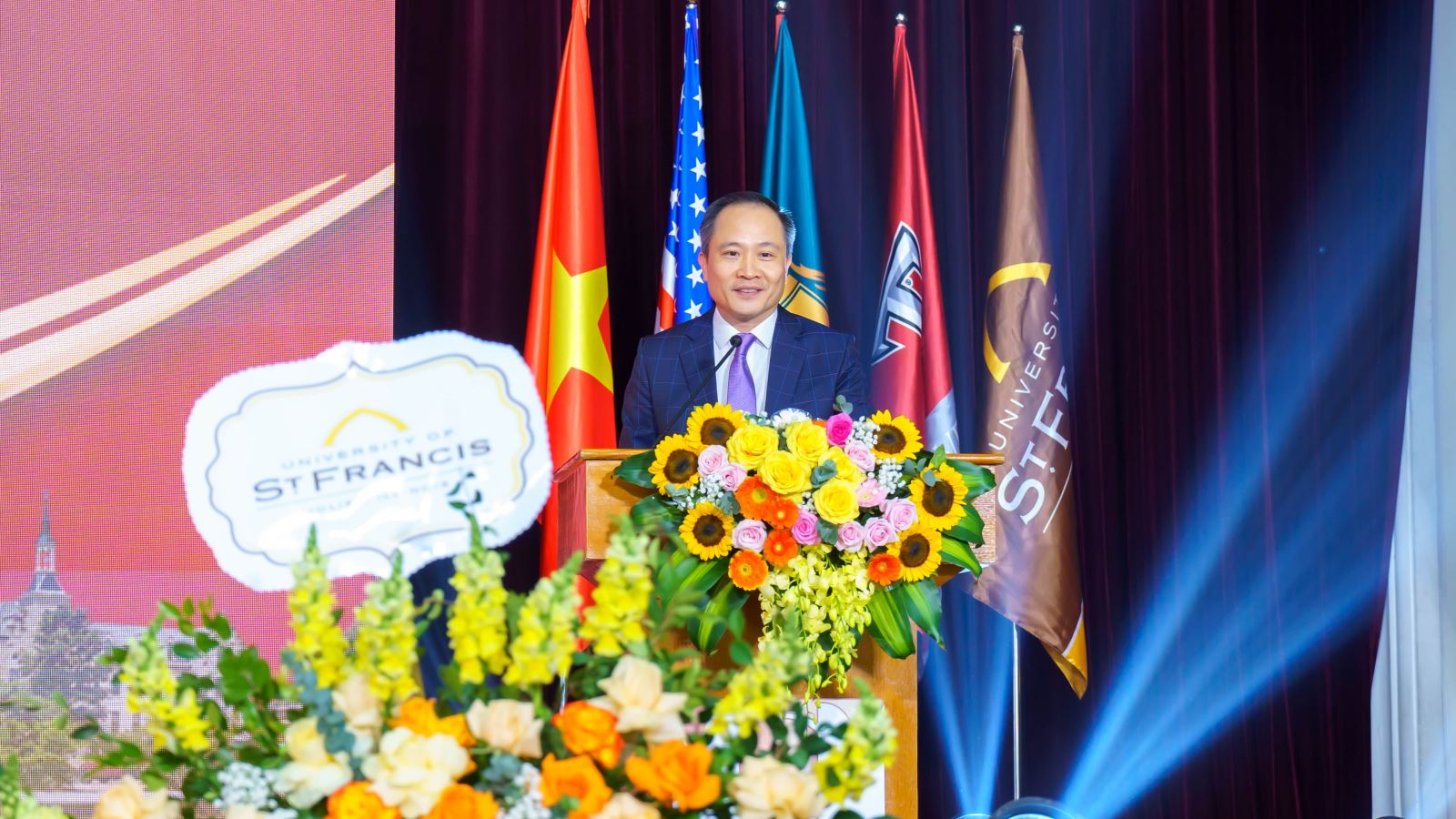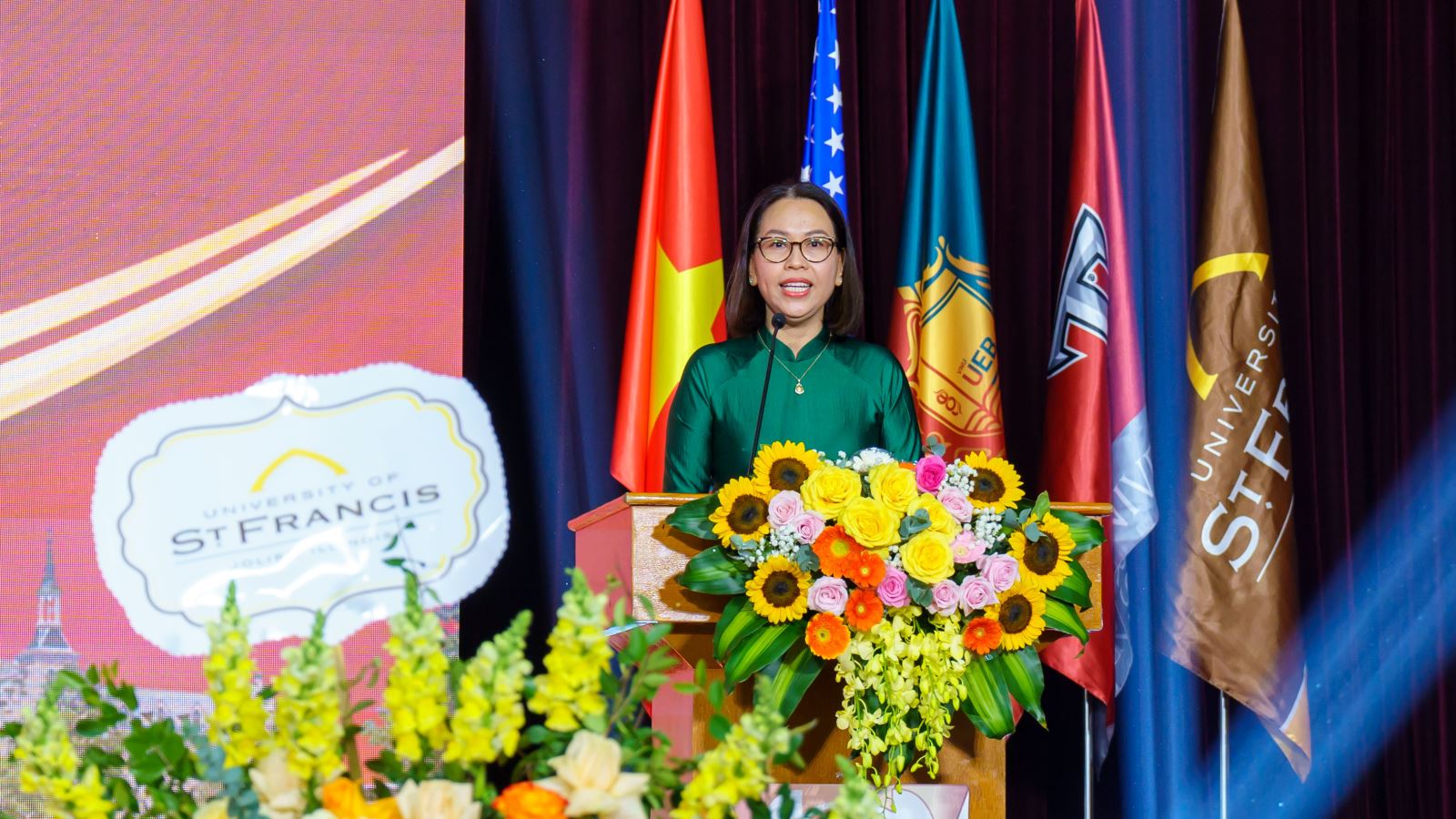 Tiếp nối chương trình là những chia sẻ từ các đối tác quốc tế là GS. Jack Hawkins - Hiệu trưởng Đại học Troy (Hoa Kỳ) và PGS.TS. Shannon Brown - Hiệu trưởng Trường Kinh doanh và Quản lý Y tế, Đại học St.Francis. Những lời chúc mừng chân thành từ các đại diện đối tác quốc tế đã khiến khán phòng như được nối liền khoảng cách nửa vòng Trái đất, thể hiện rõ tinh thần “Global Learning – Local Impact” mà SITE luôn hướng tới.